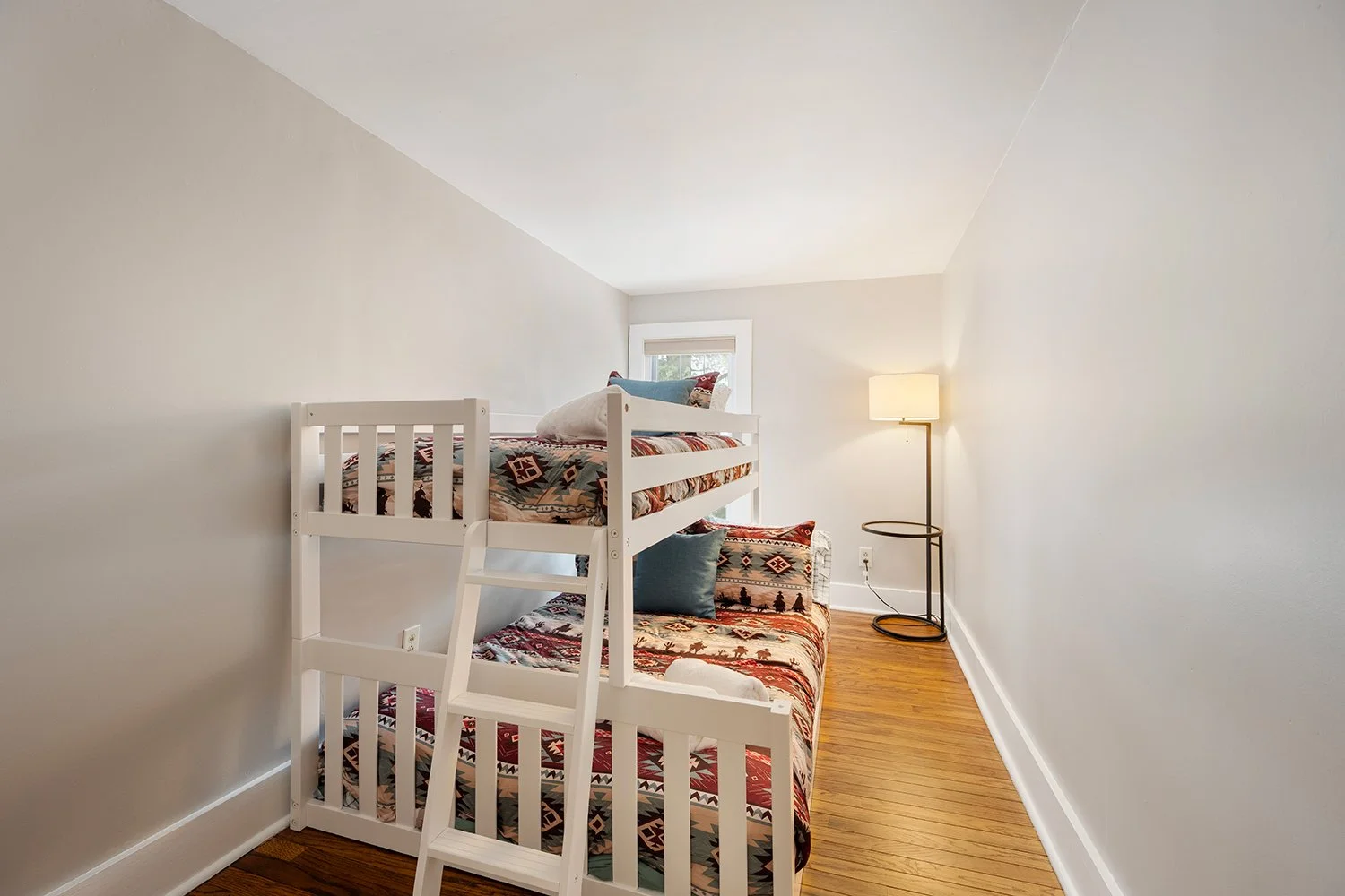The Ellicottville Farmhouse features enchanting bunk bed rooms designed for families seeking a fun and memorable sleepover experience. Each room includes a full bottom bed and a single top bunk, providing a cozy and exciting atmosphere for kids. These spaces encourage imaginative play, where children can share stories and laughter after outdoor adventures, such as exploring the pond or building snowmen. Brightly colored decor and playful accents foster creativity and excitement. The bunk bed rooms also serve as gathering spots for families to connect and reminisce about their day's adventures. Emphasizing togetherness, the farmhouse invites families to create lasting memories during their stay. Pack your bags and prepare for a joyful getaway filled with fun and bonding!